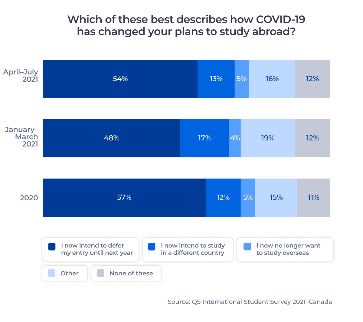With the addition of a global pandemic, the consideration of how COVID-19 factors into which country, university, and course might be the best fit for students, is now woven into their thought process. 71% of students surveyed between April and July of 2021 said that COVID-19 changed their plans to study abroad.