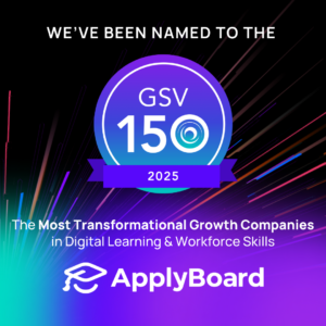 ApplyBoard has been named by Global Silicon Valley (GSV) to the 2025 GSV 150. This marks our second consecutive year on this list of the world’s most transformational growth companies in digital learning and workforce skills. This recognition reinforces ApplyBoard’s position at the forefront of education technology innovation and celebrates our continued impact on driving higher accessibility to global education.