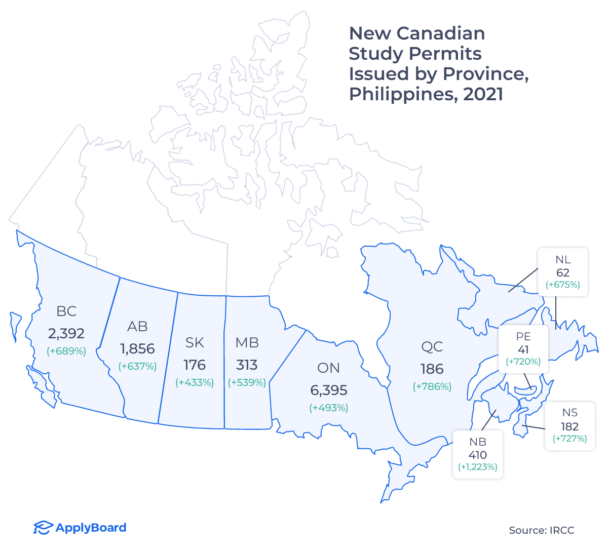 Of all the Canadian provinces that attracted Filipino students in 2021, New Brunswick had the largest increase in study permits approved. The growing province had an increase of over 12 times the number in study permit approvals in 2021 compared to last year.